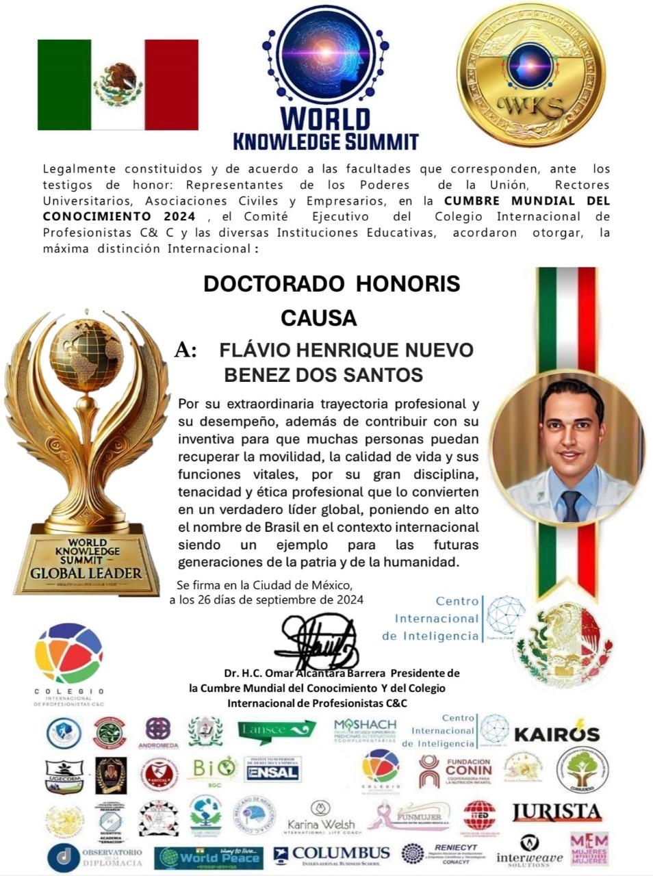 Título "Doutor Honoris Causa" concedido ao médico de Fernandópolis, Dr. Flávio Benez pela Cúpula Mundial do Conhecimento na cidade do Médico