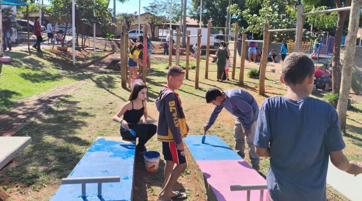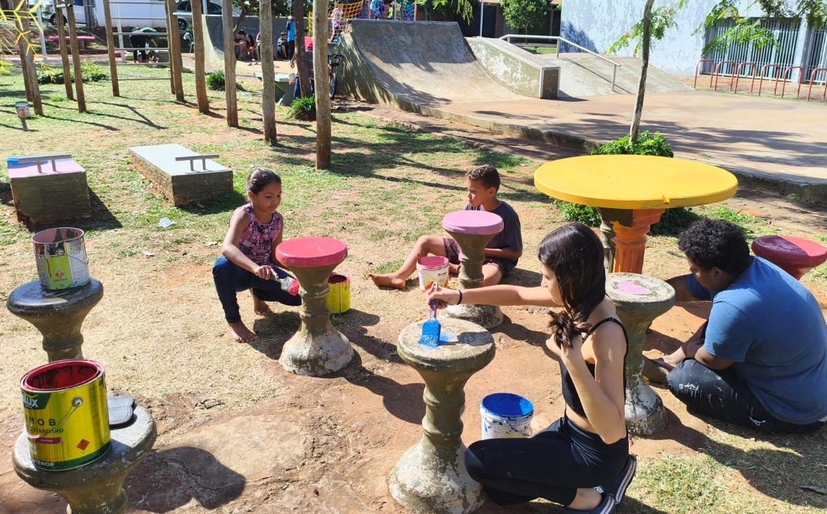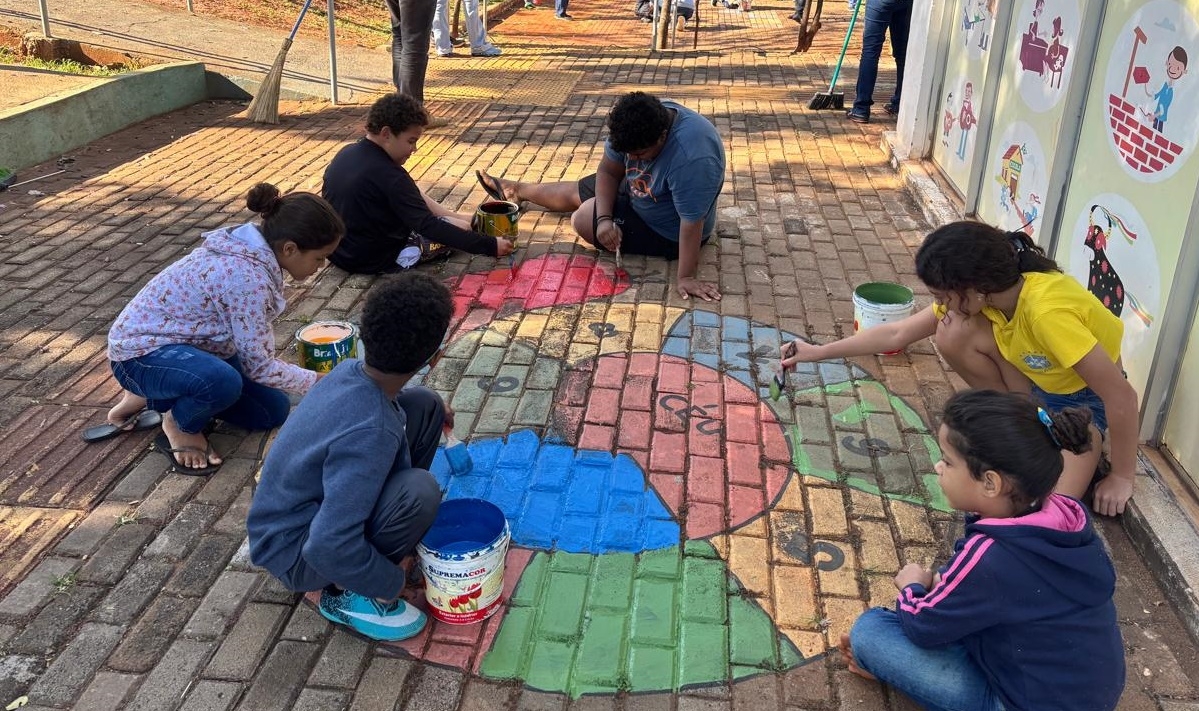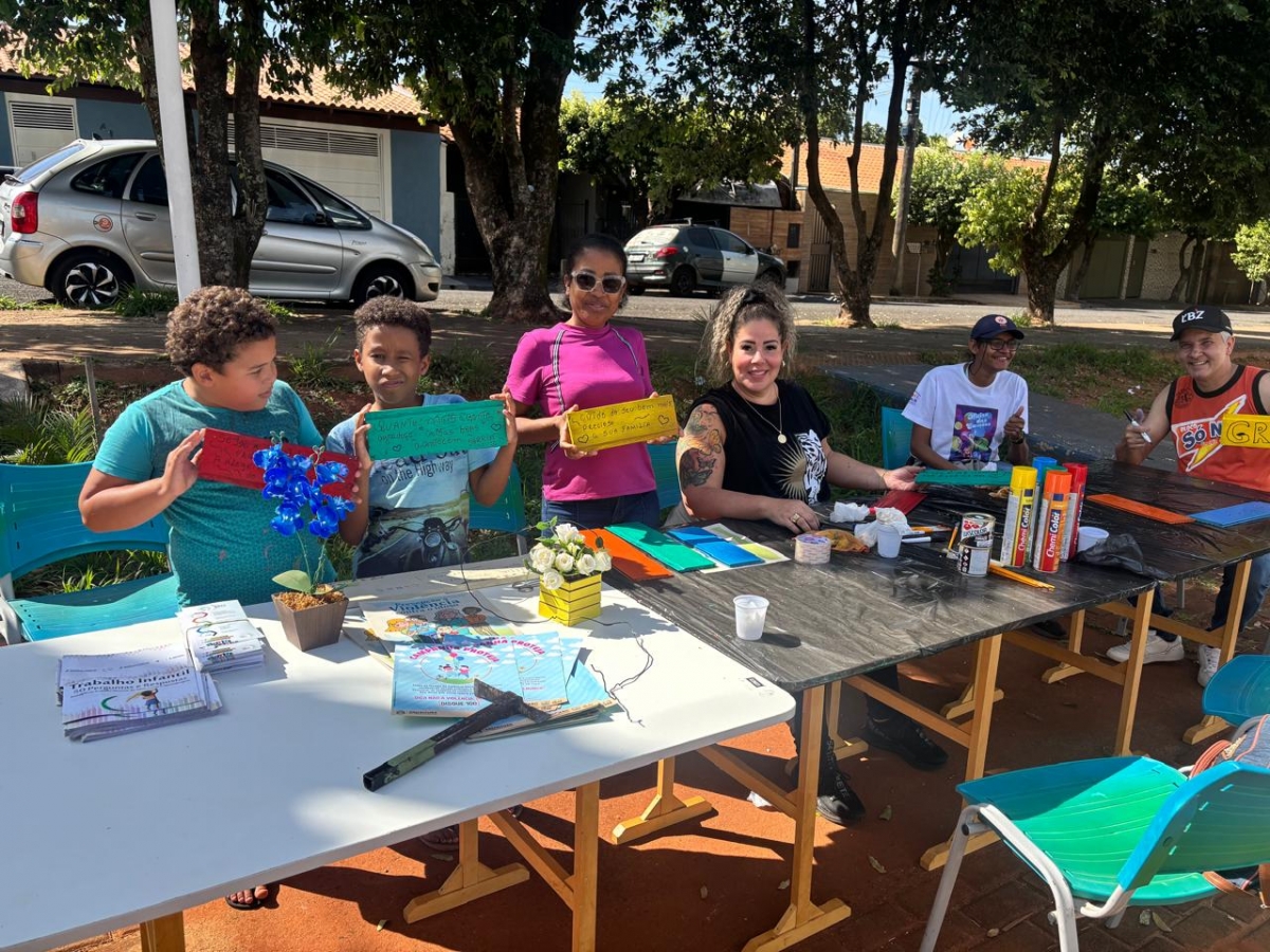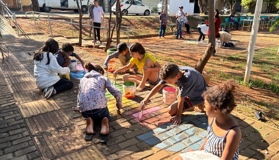 Durante a ação, a comunidade participou de diversas atividades artísticas, como pintura de bancos, amarelinha e caracol no chão, além da criação de plaquinhas com frases motivacionais, fixadas nas árvores ao redor do CRAS.