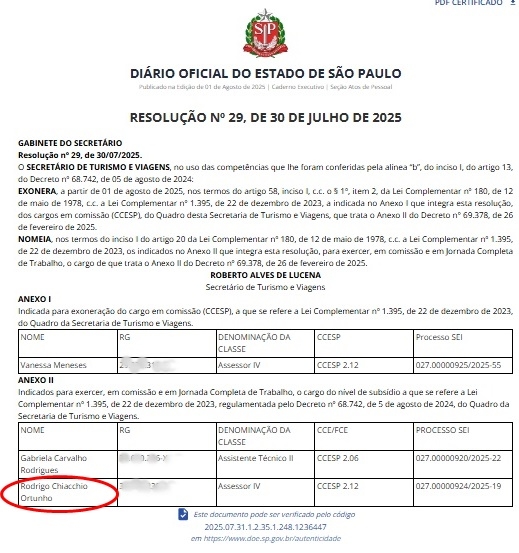 O secretário de Turismo e Viagem do governo do Estado de São Paulo, Roberto Alves de Lucena, nomeou o ex-candidato a prefeito de Fernandópolis Rodrigo Ortunho (Republicanos) para o cargo de assessor especial da pasta.