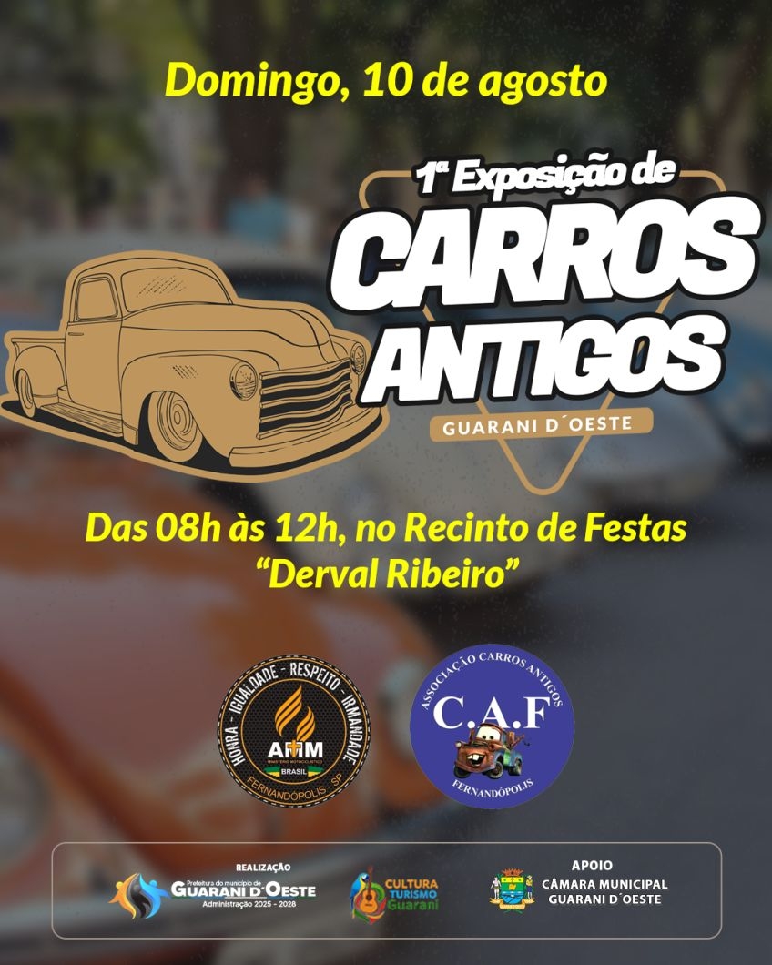 A programação continua no domingo, dia 10, a partir das 8h, com a primeira exposição de carros antigos e exóticos de Guarani d’Oeste.