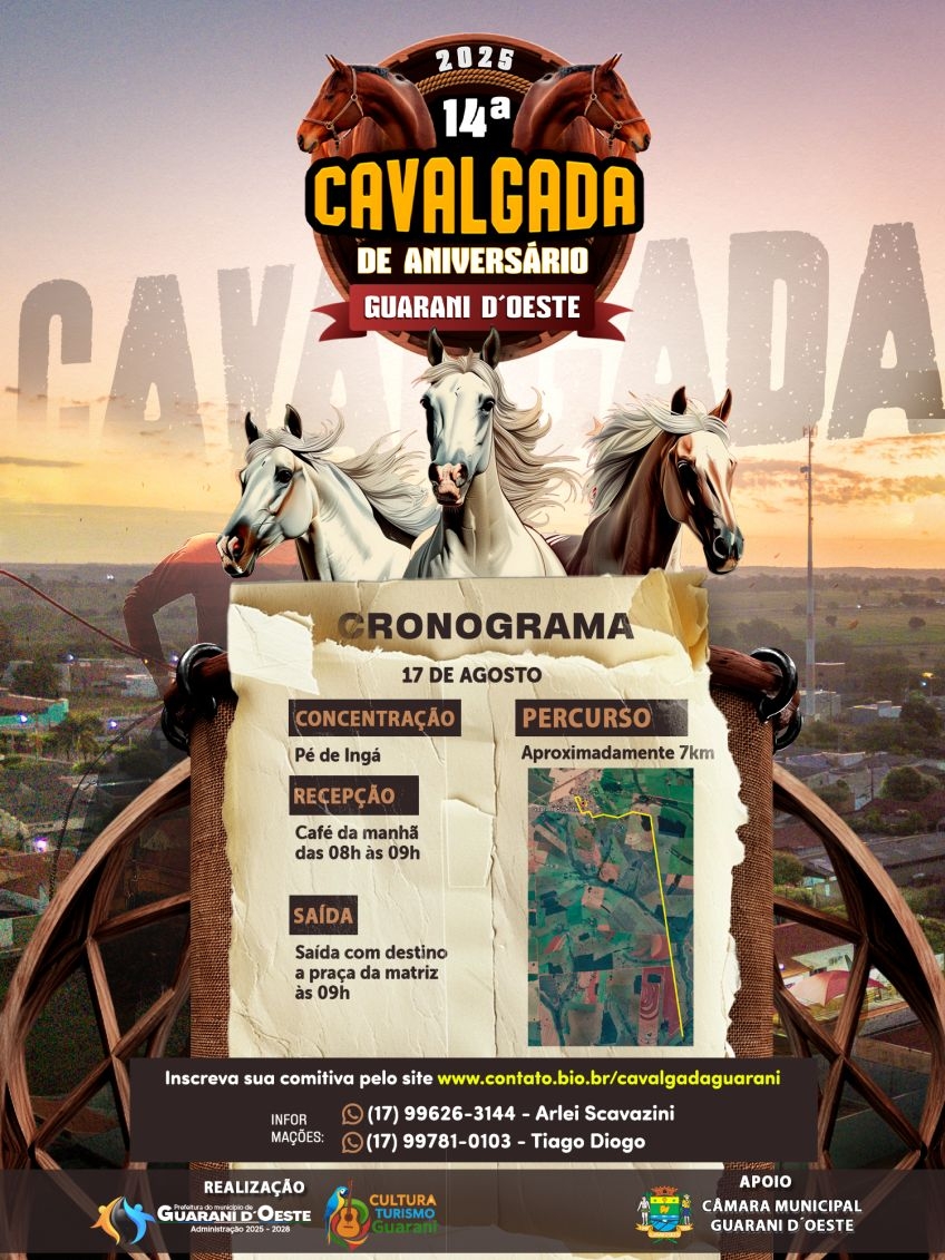 No domingo, 17 de agosto, véspera do aniversário da cidade, será realizada a tradicional Cavalgada, a décima quarta edição chega com uma novidade: o ponto de encontro dos cavaleiros e amazonas será no “Pé de Ingá”. O novo percurso terá aproximadamente 7 quilômetros e contará com estrutura de apoio, incluindo banheiros químicos, pontos de hidratação e bebedouros para os animais.