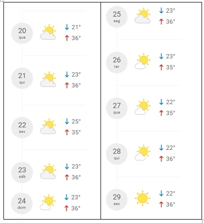 As regiões, oeste, noroeste e central do Estado de São Paulo também devem enfrentar picos de calor, com máximas que podem chegar a 36°C (veja abaixo a previsão de temperaturas para Fernandópolis entre os dias 20 e 29 de agosto).