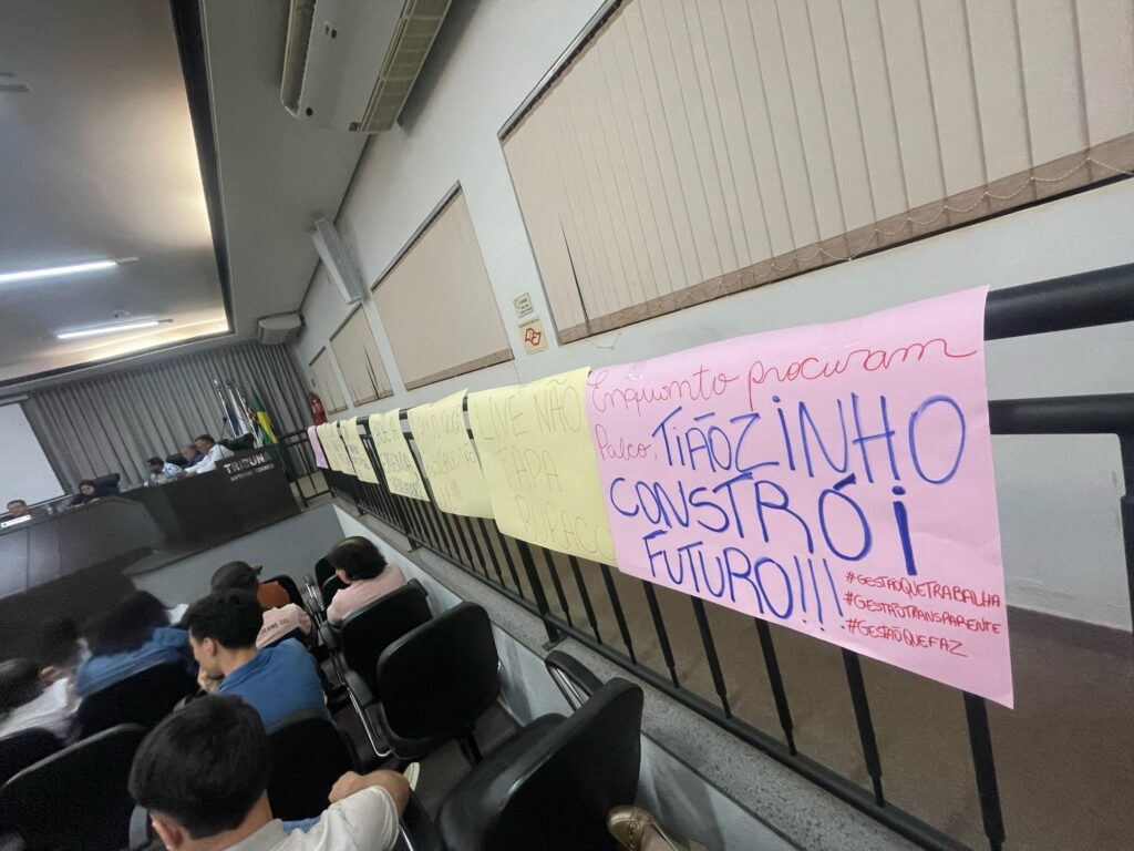 A sessão contou com forte presença de munícipes, muitos deles manifestando apoio ao prefeito. Cartazes, falas em defesa da atual administração e discursos acalorados marcaram a reunião legislativa.