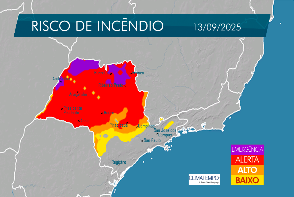 De acordo com o mapa de risco do órgão estadual, as condições são críticas até sábado (13) em boa parte do território paulista, especialmente nas regiões norte, nordeste, noroeste e oeste.