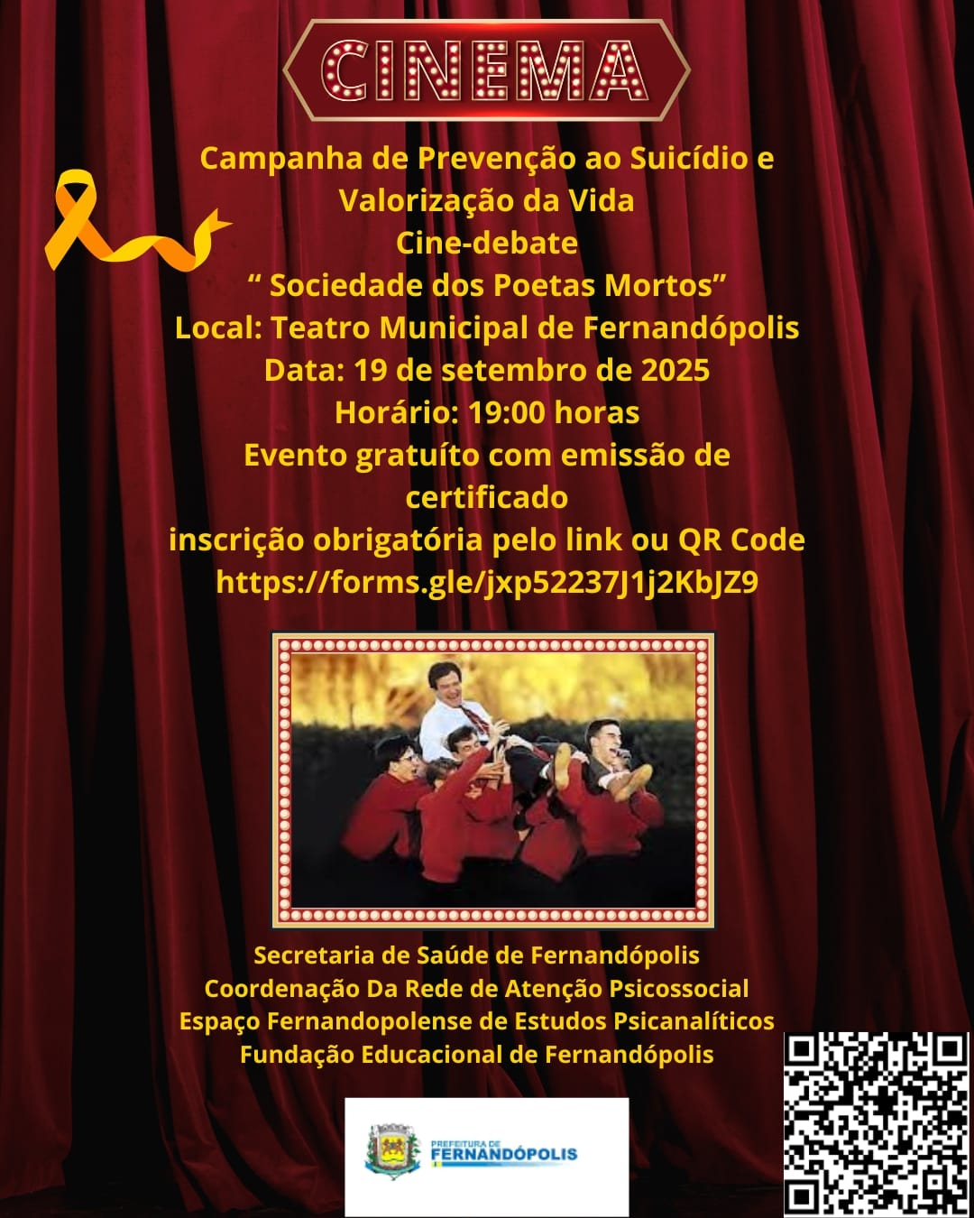 A Secretaria Municipal de Saúde, por meio da Rede de Atenção Psicossocial, realizará na próxima sexta-feira,19, às 19h, no Teatro Municipal, a exibição gratuita do filme “Sociedade dos Poetas Mortos”. A ação integra a programação do Setembro Amarelo, campanha dedicada à valorização da vida e à prevenção do suicídio. O evento é aberto ao público, com emissão de certificado aos participantes, porém é obrigatória a inscrição prévia, que pode ser feita por meio do link ou pelo QR Code disponível na arte de divulgação.