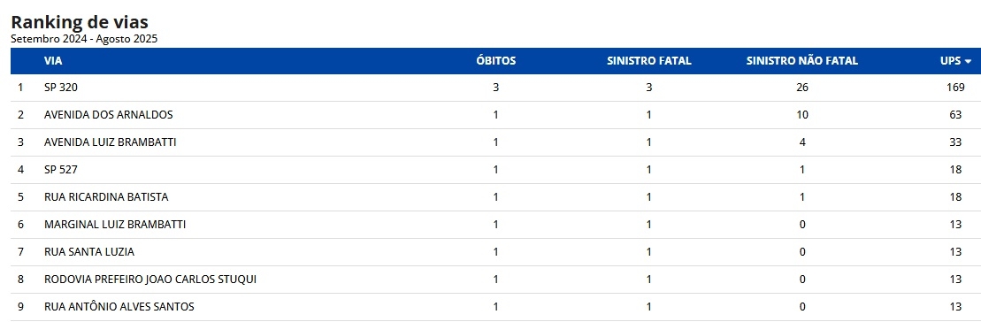 Em Fernandópolis, a Rodovia Euclides da Cunha (SP-320) lidera o ranking local com: 3 mortes, 3 acidentes fatais e 26 acidentes não fatais. O UPS (Índice de Severidade): 163 é o mais alto da cidade. O indicador UPS, utilizado pelo Infosiga, combina estatísticas de sinistros fatais e não fatais para destacar vias mais críticas.