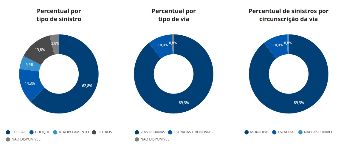 Foram 251 colisões entre veículos (62,8%), 57 choques contra obstáculos (14,3%), 22 atropelamentos (5,5%), 55 definidos como “outros” (13,8%) e 15 não disponível (3,8%).
