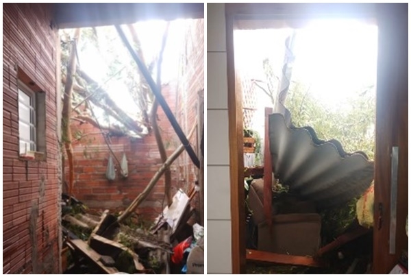 Um dos casos mais preocupantes ocorreu em uma residência, onde uma árvore de grande porte caiu sobre a estrutura do imóvel. Apesar do susto e dos danos materiais, não houve registro de feridos.