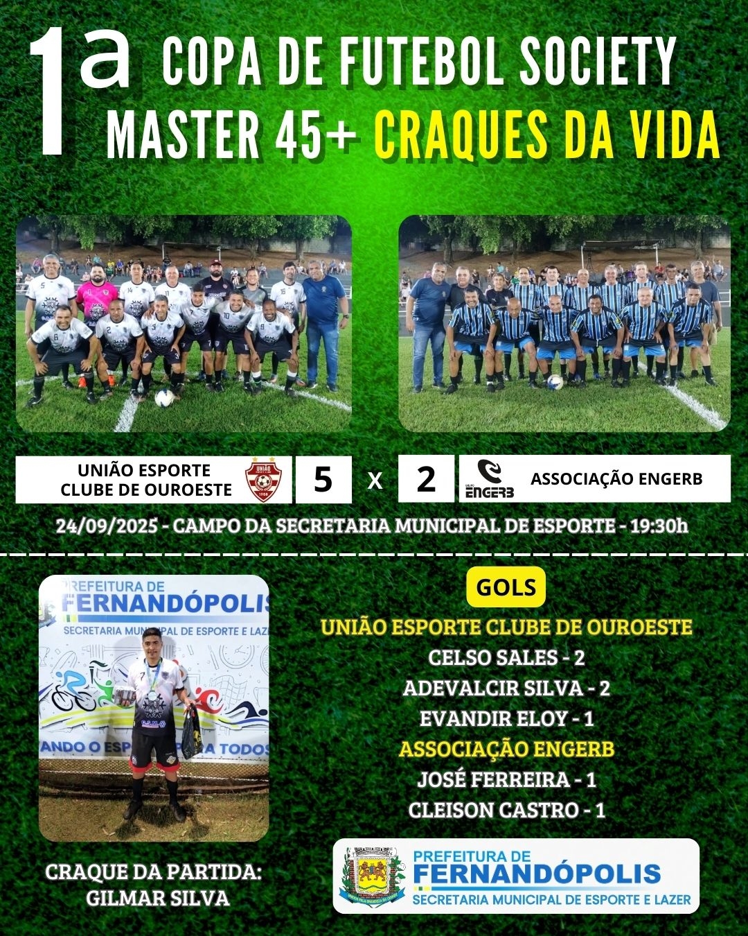 Na noite da última quarta-feira (24), foi realizada mais uma rodada da 1ª Copa de Futebol Society Master 45+. Em um dos confrontos, o União Esporte Clube de Ouroeste venceu a Associação Engerb pelo placar de 5 a 2.