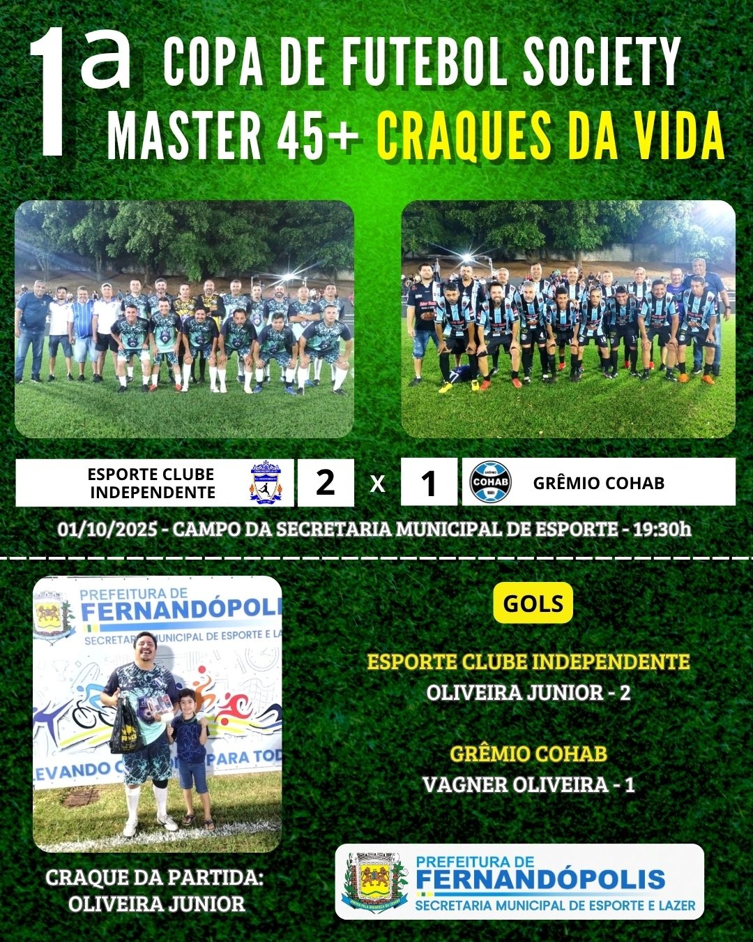 Na rodada desta quarta-feira, 1º de outubro, da “1ª Copa de Futebol Society Craques da Vida”, no campo da Secretaria Municipal de Esportes e Lazer de Fernandópolis, o Esporte Clube Independente venceu o Grêmio Cohab por 2x1. O destaque da partida foi Oliveira Junior, autor dos dois gols do Independente. Vagner Oliveira marcou o gol de honra do Grêmio Cohab.