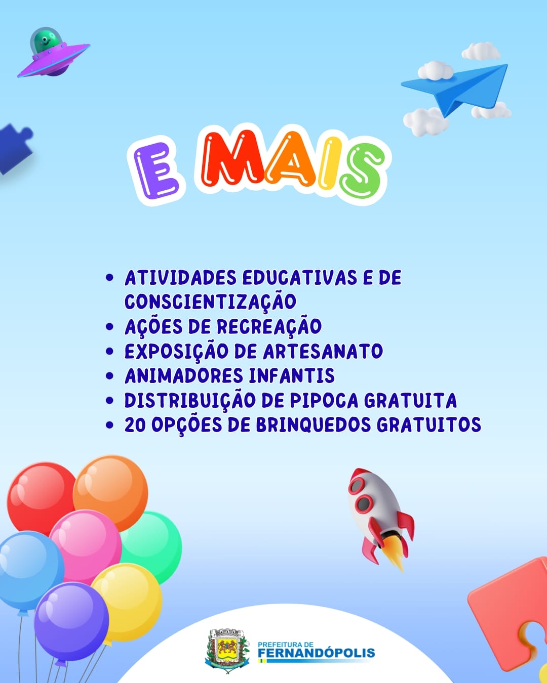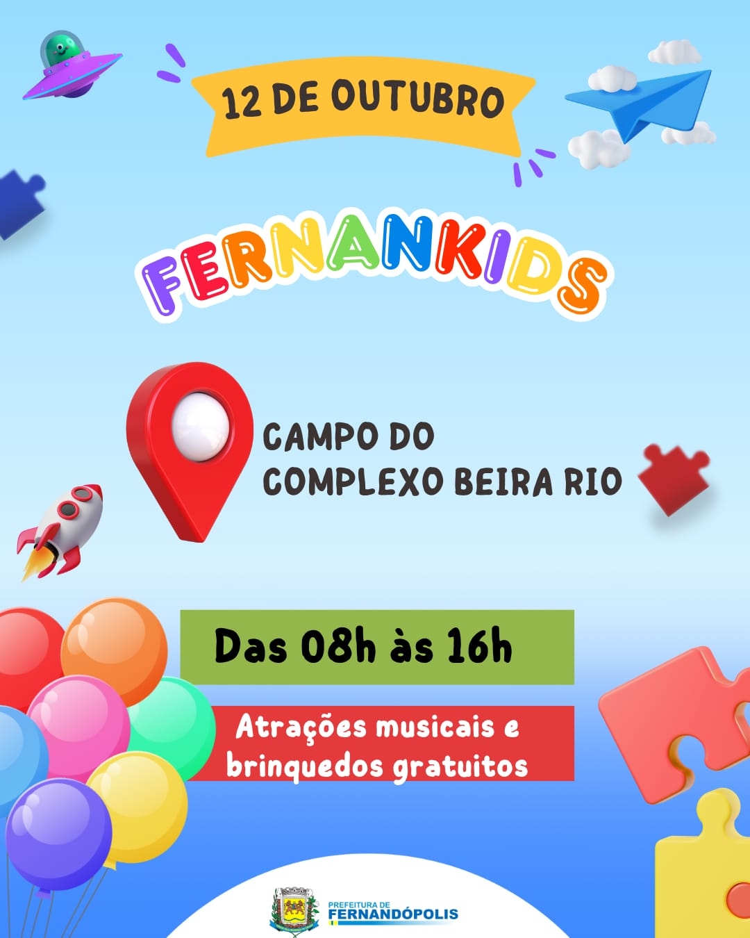 Fernandópolis se prepara para mais uma edição do tradicional FernanKids, que será realizado no omingo (12), Dia das Crianças, no campo do Complexo Beira Rio. O evento, promovido em comemoração ao Dia das Crianças, contará com uma programação gratuita repleta de atrações, atividades recreativas e serviços para toda a família.