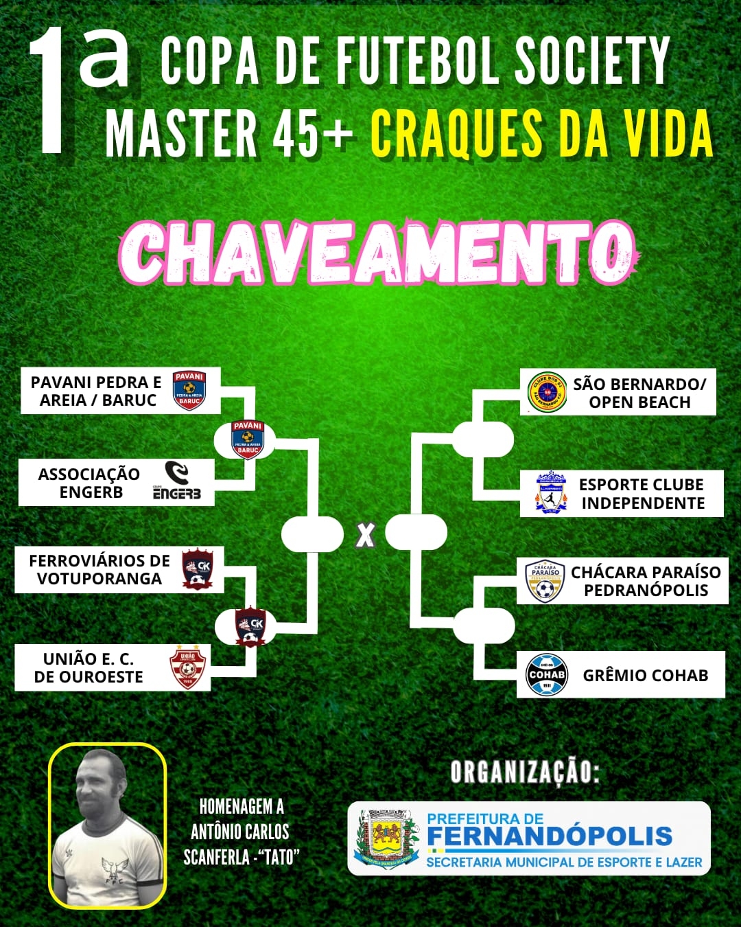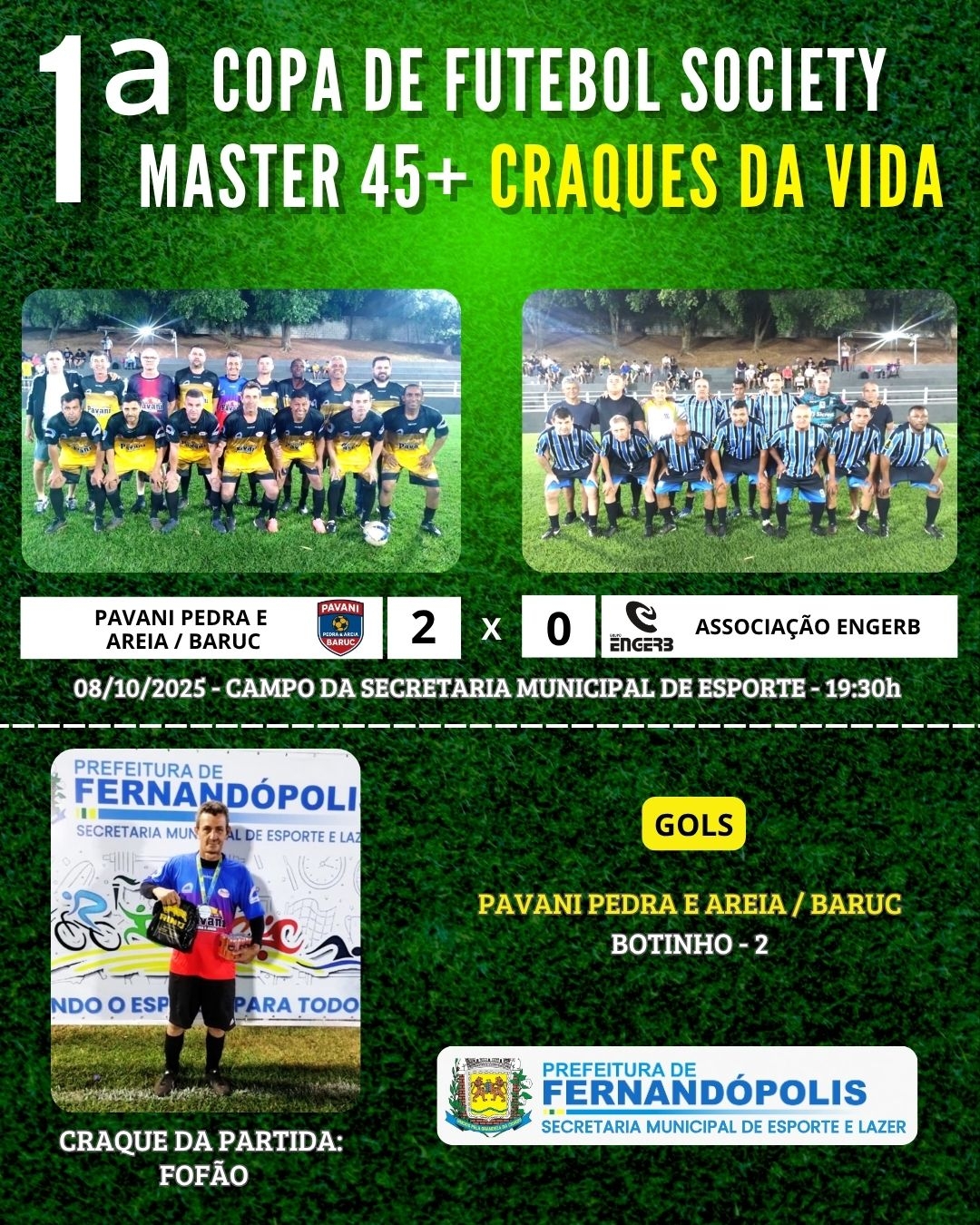 Na noite desta quarta-feira (08), foi realizada a primeira rodada das quartas de final da 1ª Copa de Futebol Society Master 45+. No primeiro confronto, a equipe Pavani Pedra e Areia/Baruc venceu a Associação Engerb por 2 a 0, com dois gols marcados por Botinho. O jogador Fofão, da equipe vencedora, foi eleito o craque da partida.