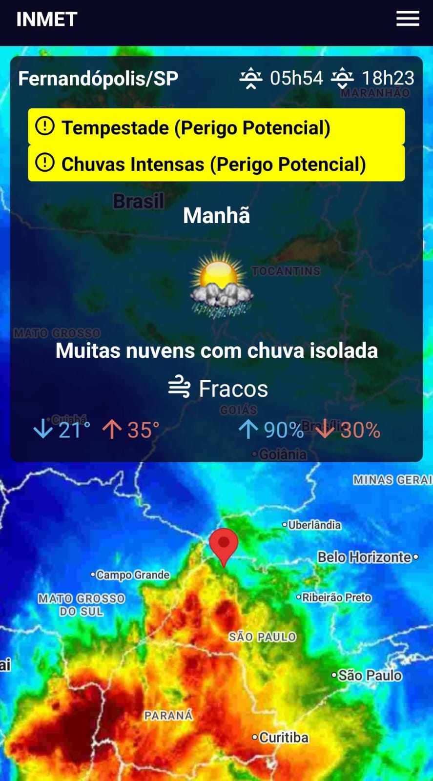 O Inmet – Instituto Nacional de Meteorologia – publicou em seu aplicativo alerta de chuva forte e risco de tempestade para a região de Fernandópolis neste domingo, especialmente para o período da tarde.