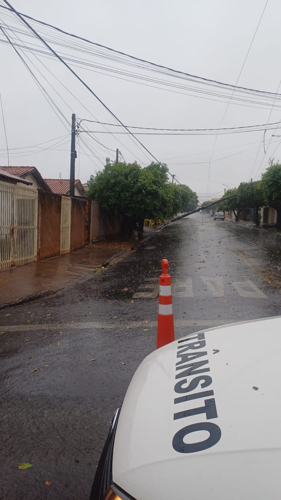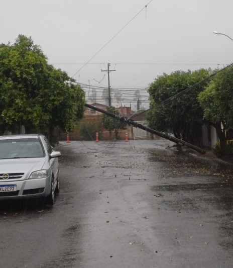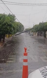 Uma forte chuva acompanhada de ventos intensos causou diversos transtornos na cidade na tarde deste sábado (18), por volta das 13h30. No bairro Albino Mininelli, na Rua José Pereira Vieira, próximo à escola do Sesi, a ventania derrubou um poste de energia, que não resistiu à força do vento e caiu, arrastando fios e cabos de internet e energia elétrica para o solo, representando risco grave de acidentes.