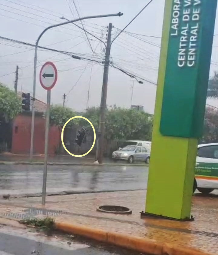 Outro ponto afetado foi o cruzamento da Avenida dos Arnaldos com a Rua Pernambuco, onde o semáforo central se desprendeu do poste ficou pendurada no meio da avenida com risco de acidente.