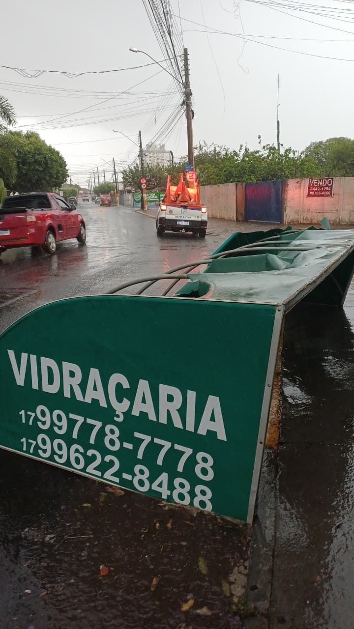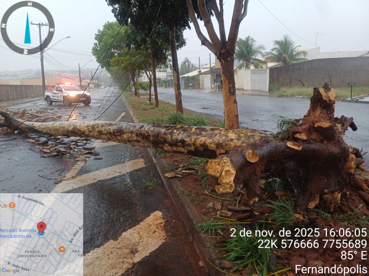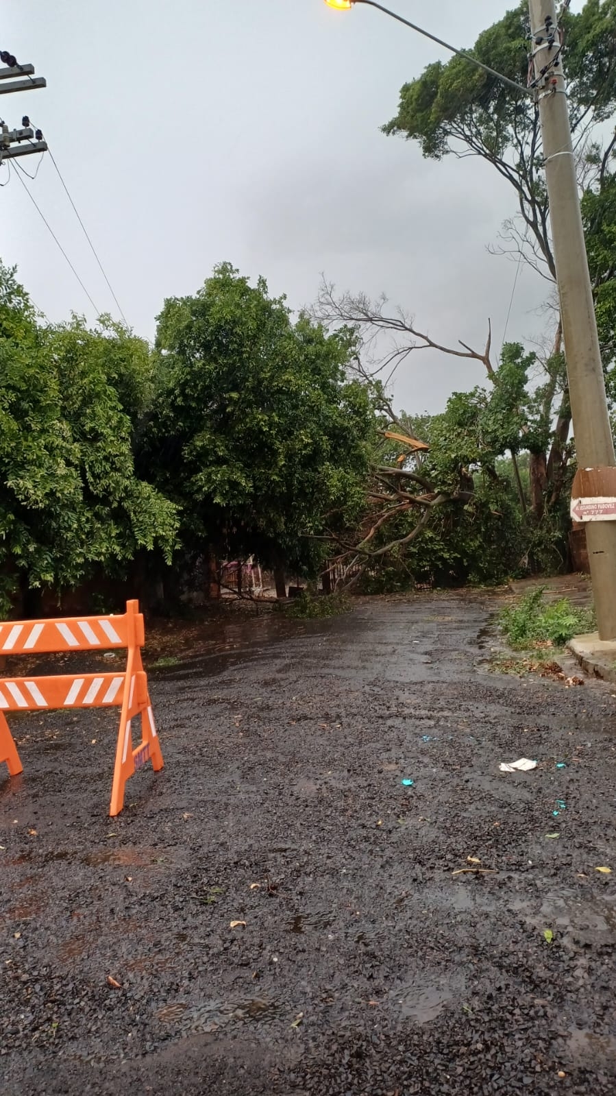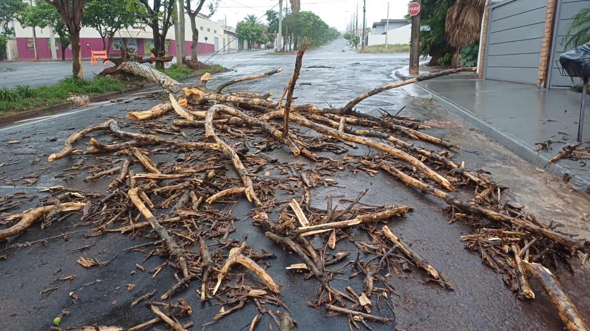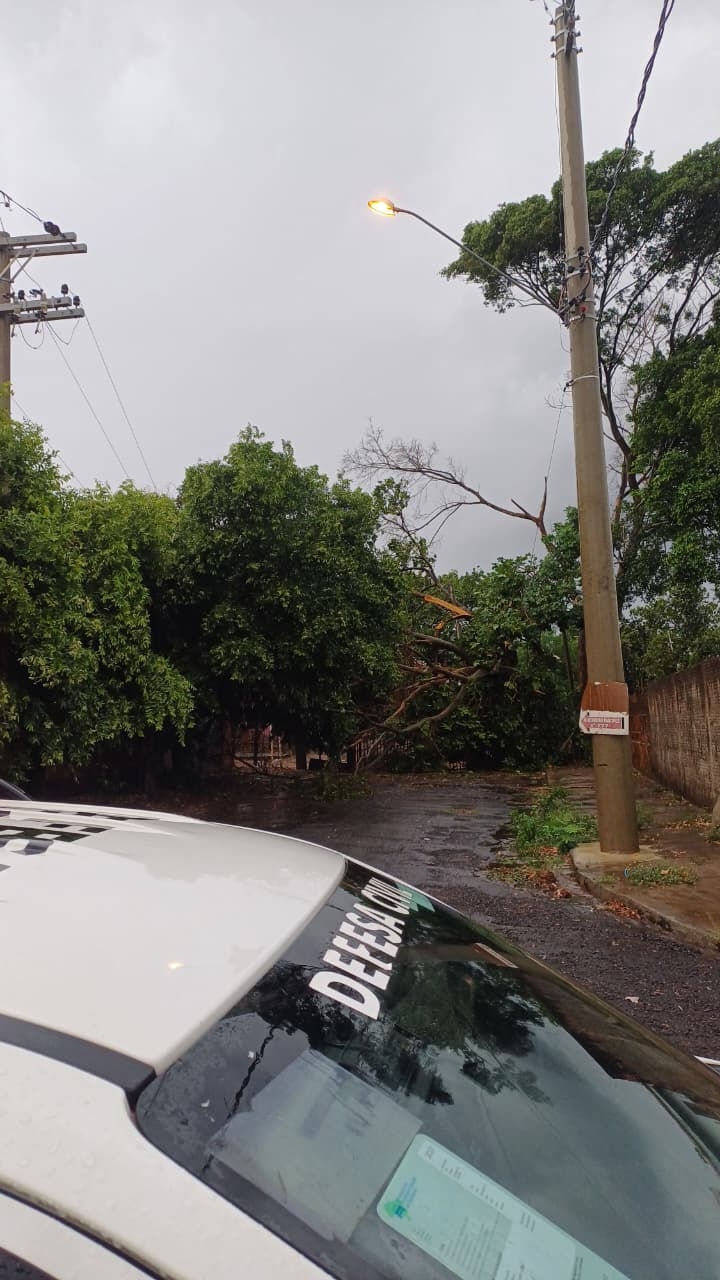 A ocorrência mais grave foi registrada no bairro Morada do Sol, onde uma árvore caiu sobre a rede elétrica primária, derrubando fiação e um transformador sobre uma residência.