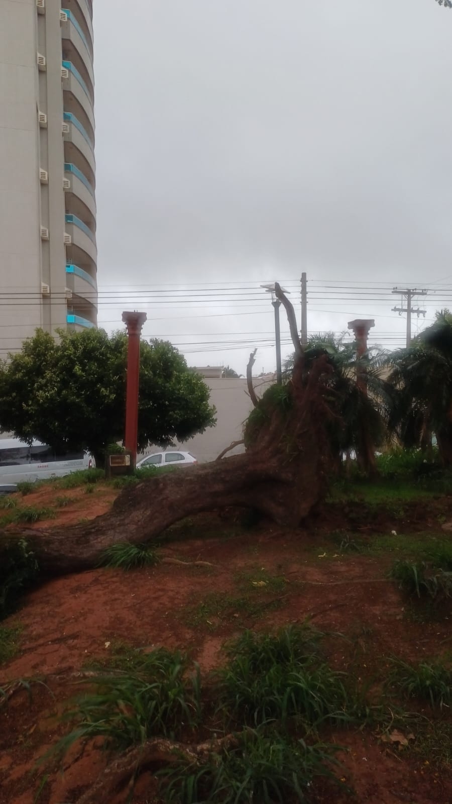 Uma forte ventania no início da tarde desta quarta-feira (5) derrubou uma árvore de grande porte Praça Cesar Duarte Azadinho, que abriga o Teatro e Biblioteca Municipal de Fernandópolis. O incidente ocorreu por volta das 14h30, marcando o início de um temporal que atingiu a cidade.