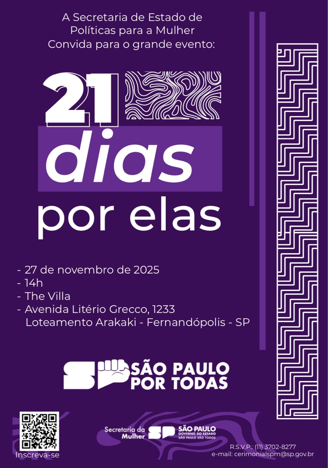 A Secretaria de Estado de Políticas para a Mulher, em parceria com a Prefeitura de Fernandópolis, promove no dia 27 de novembro, às 14h, o evento “21 Dias de Ativismo pelo Fim da Violência contra as Mulheres”. A atividade será realizada no espaço The Villa, na Avenida Litério Grecco.