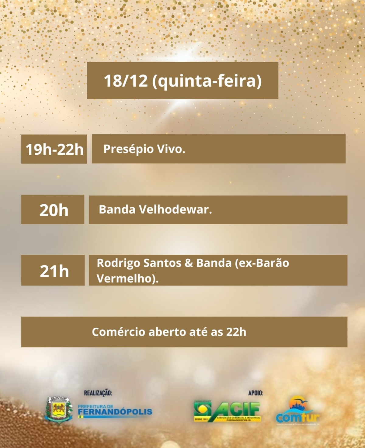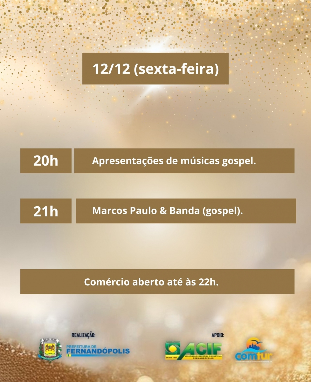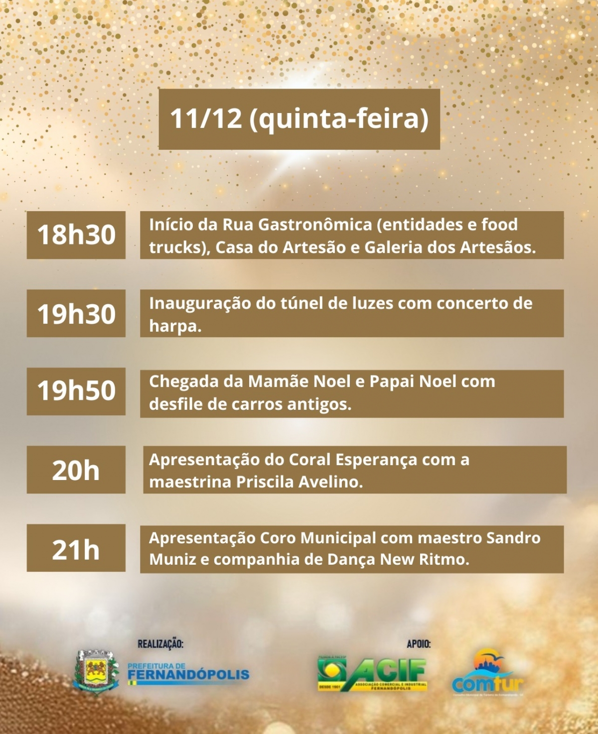 Outro destaque é o acendimento do Túnel de Luzes na Rua São Paulo, criado em parceria com a ACIF. Com mais de 50 mil pontos de luz, o local promete ser um dos principais cenários para fotos e encontros durante toda a programação.