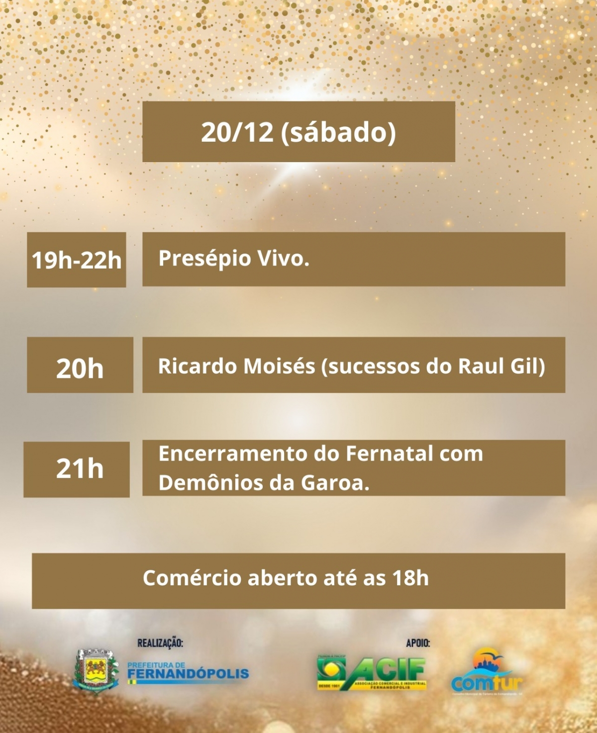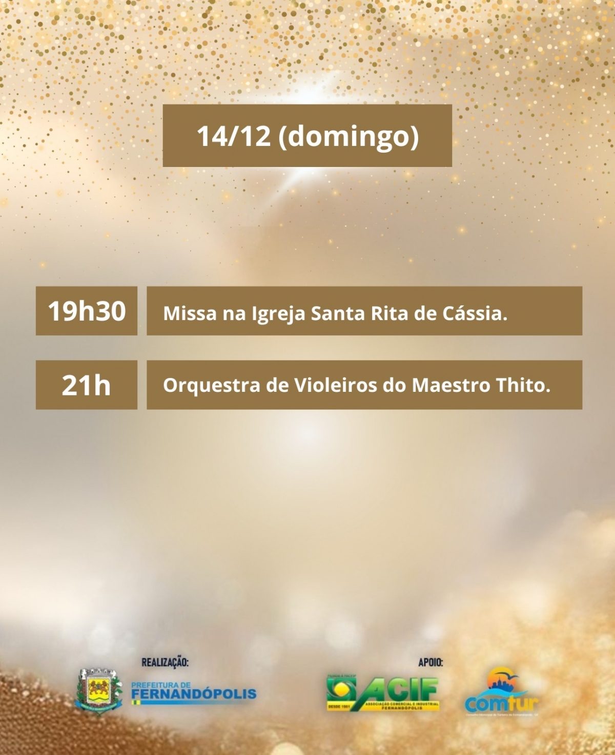 O Papai Noel e a Mamãe Noel chegam à cidade em uma carreata de carros antigos, organizada pela CAF (Carros Antigos Fernandópolis) e CVAF (Clube Veículos Antigos Fernandópolis). A concentração será nesta quinta-feira, às 18h40, na Praça da Brasilândia, com saída às 19h. O percurso segue pela Avenida Líbero de Almeida Silvares até a Avenida Expedicionários Brasileiros, chegando à rotatória da Casa & Jardim, onde ocorre o retorno. De lá, os veículos voltam pela Expedicionários em direção à Praça da Matriz, onde o trajeto será encerrado. Papai Noel e Mamãe Noel atenderão o público na Casinha do Papai Noel até 20 de dezembro.