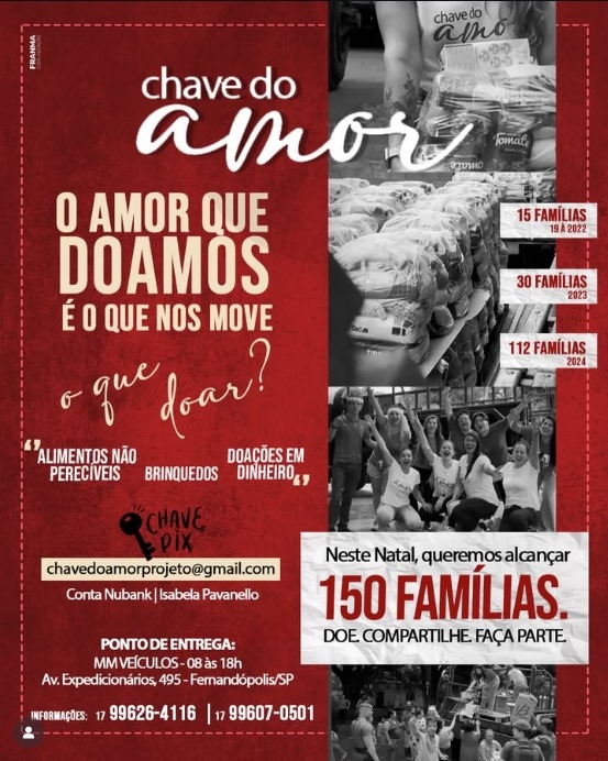 A campanha “Chave do Amor” está ativa em várias frentes: arrecada alimentos não perecíveis, brinquedos e também doações via PIX (Chave PIX - chavedoamorprojeto@gmail.com).