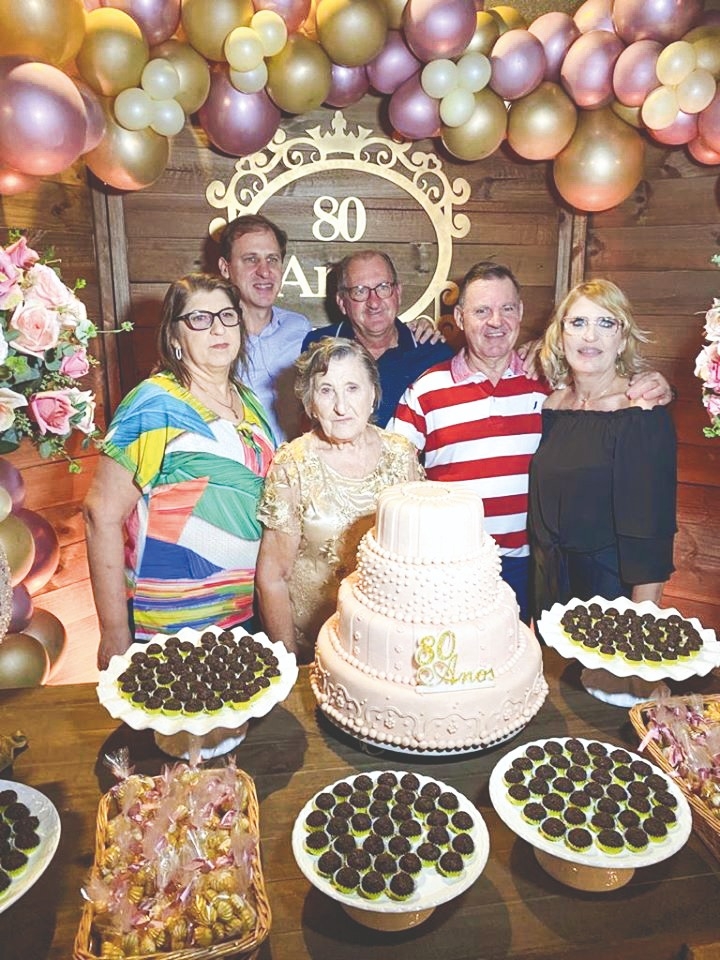 Dona Zefira celebrou em grande estilo a chegada dos bem vividos 80 anos. Na foto com os filhos: Silmara, Toninho, Divaldo, Reinaldo e Débora