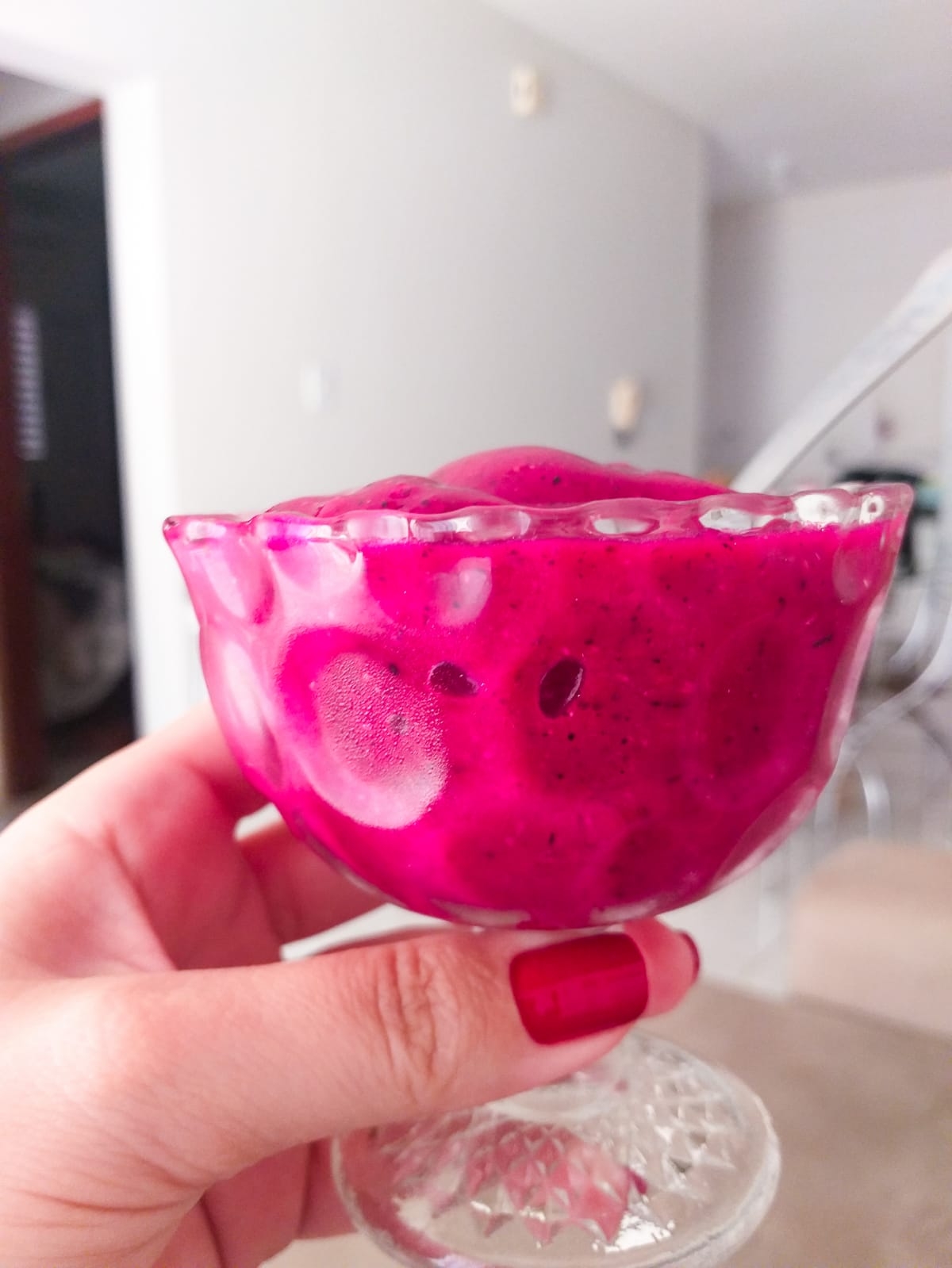 Quando cheguei da feira com as pitayas em casa já fui logo experimentar uma receita que vi no Instagram da modelo e influenciadora digital Taty Betin de um smoothie de pitaya com morango. Que na verdade fica parecendo um sorvetinho mole. É mega saudável, vegano, cheio de nutrientes e sabe o que mais? É facíiiiliiiimooo de fazer!!!! Basta bater no mixer ou liquidificador uma pitaya média com meia caixinha de morangos congelados. Pronto! Fica delicinha e com uma cor maravilhosa!