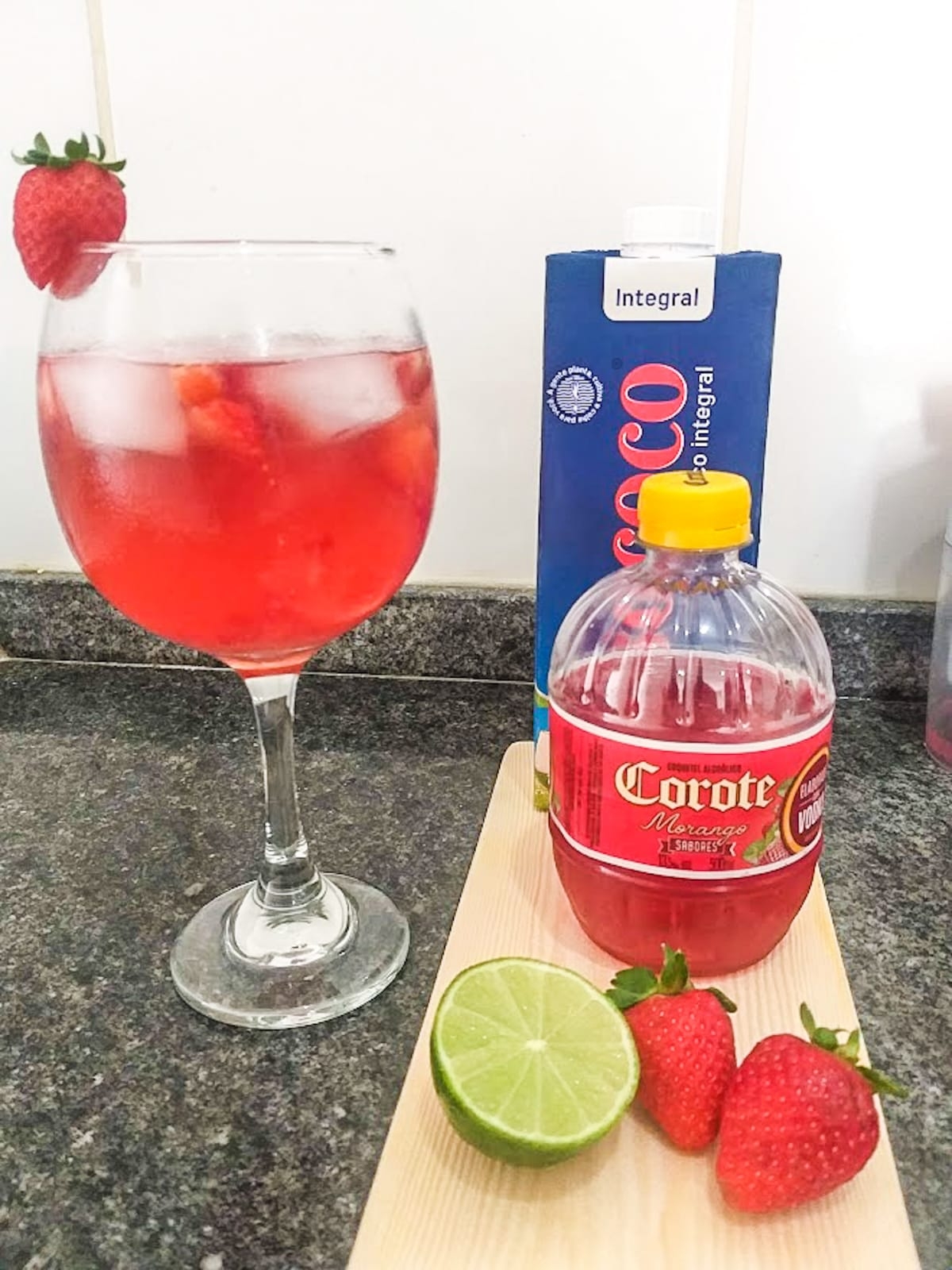 Óbvio que teria que ter um drink, né? E esse é super tendência e BBB (bom, bonito e barato). Como sempre faço no olhometro, coloquei morango e amassei ele dentro da taça, coloquei gelo, Corote de morango, meio limão espremido e água de coco. Fica dos Deuses!! Não coloquei açúcar, mas vai do seu paladar.