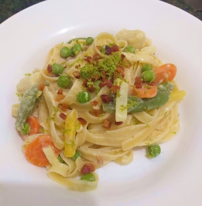 Outra invenção de um dia desses foi um talharim com molho al limone com legumes e ervilhas frescas. O molho é bem simples, a base de manteiga, limão e creme de leite. Os legumes fiz salteados no azeite. Bastou misturar tudo e finalizar com raspinhas de limão. Fica bem leve, refrescante e ácido! É um prato que tem a cara do verão. Colorido, fresh e delicioso. No lugar de legumes, pode deixar só o molho ou acrescentar camarões também. Um luxo para servir num almoço em um belo dia de sol.