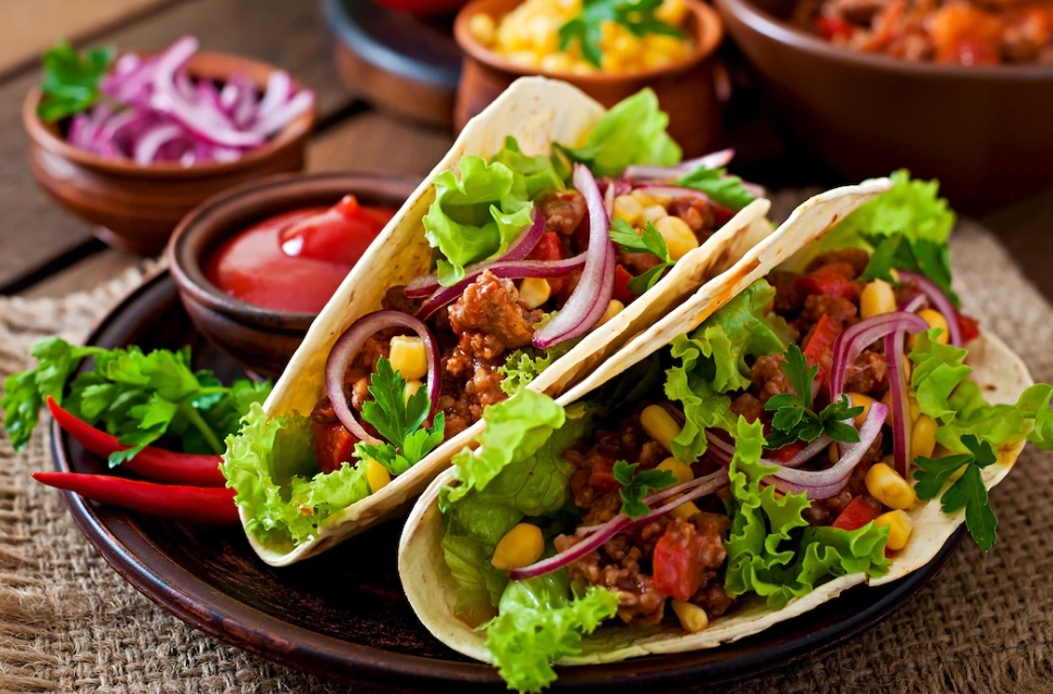 Os tacos mexicanos também são uma iguaria muito consumida do país e, em todo o mundo. Eles são feitos de uma massa fina de milho frita, chamada tortilla, que fica no formato de uma concha para receber o recheio, que geralmente pode ser um chilli de carne, guacamole ou frango. Os tacos são servidos com molho salsa, que é tipo uma vinagrete mais apimentada.