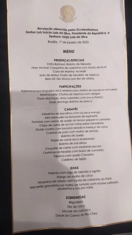 No dia 1 de janeiro aconteceu a posse do novo presidente Luiz Inácio Lula da Silva e, após o cerimonial que durou a tarde inteira, Lula ao lado da esposa e primeira dama, Janja, recepcionou os cerca de 2 mil convidados no Palácio do Itamaraty para um jantar assinado por chefs brasileiros como Bela Gil e Kátia Barbosa e um cardápio bem tupiniquim.