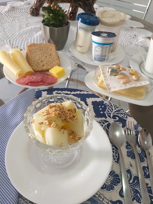 Durante a semana com a correria do dia-a-dia fica difícil fazer algo caprichado. Confesso que prefiro dormir mais! (risos) Mas, aos finais de semana gosto de caprichar, montar uma mesa bonita e, quase sempre, uso o que tenho em casa mesmo. Geralmente separo algumas frutas para comer com iogurte natural e granola, amo pão de queijo, misto quente na sanduicheira, bisnaguinha, café, cappuccino, suco de laranja, água de coco, enfim, vou de acordo com o que tem na geladeira e com a minha fome! Rsrs. Ah! Aos domingos também vale como café da manhã aquele pastel de feira com caldo de cana. Eu amo!