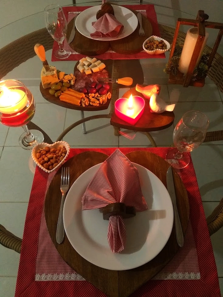 Para criar um clima especial aposte em um jantar à luz de velas. A decoração em si não precisa ser temática, confira os itens que você já possui em casa de mesa posta e apenas incremente. Se for em tons de vermelho e branco, melhor ainda! Peças em formato de coração também dão um charme a mais. Quem quiser incrementar com flores também vale! (fica a dica) O segredo de tudo é o carinho e o capricho.