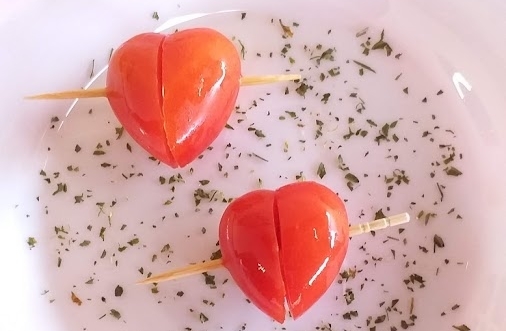 Mesmo com zero habilidades na cozinha você pode impressionar com um simples petisco de tomate cereja em formato de coração. Basta cortar o tomatinho na diagonal do comprimento inverter uma parte e espetar com um palito. Fica linduxo assim!