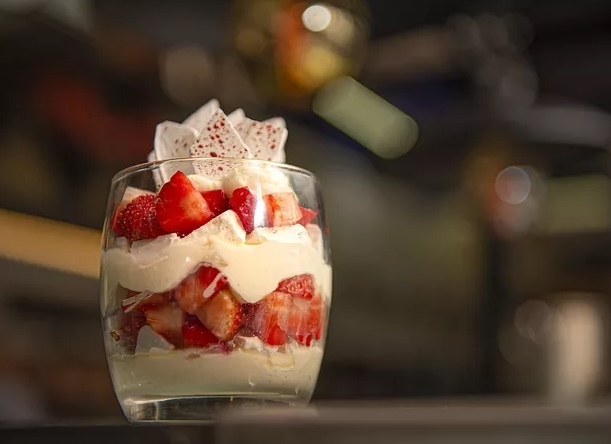 5. Termine a montagem com chantily e suspiros, mas deixando aparecer um pouco de camada anterior de morango.