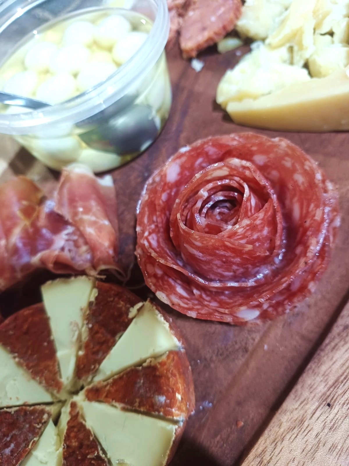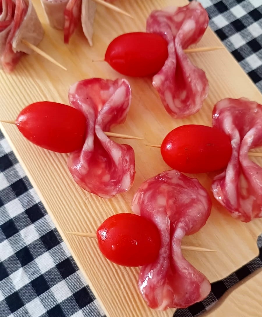 A segunda sugestão é uma gravatinha com a fatia de salame e um tomatinho cereja presos com um palito de dente. Basta uma dose generosa de capricho que fica tudo lindo e deixa qualquer simples tábua de frios uma preciosidade. Outra dica também com salame é a rosa que você pode utilizar um copo ou uma taça. Basta ir colocando as fatias dobradas na borda da taça e fazendo camadas. Pressione bem as bordas e vire sobre a tábua, prontinho! Fica um escândalo de linda. Ah! Além do salame, também pode ser usado o lombinho canadense, que também dá o mesmo efeito.