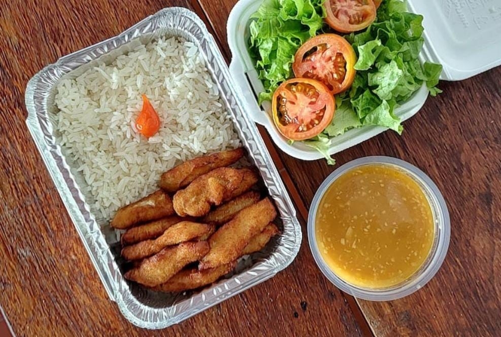 Outra opção que provei essa semana, conheci pelo Ifood e, me apaixonei. É o Senhor Porção. Pedi uma refeição chamada Iscas de frango empanado. Recebi uma marmita com o frango e o arroz. Em um pote o feijão e em outra vasilha a salada de alface, tomate. Confesso que já fiquei surpresa com tamanho capricho e quando fui comer, mais ainda! Gostinho de comida caseira. Suculenta e com tempero na medida.